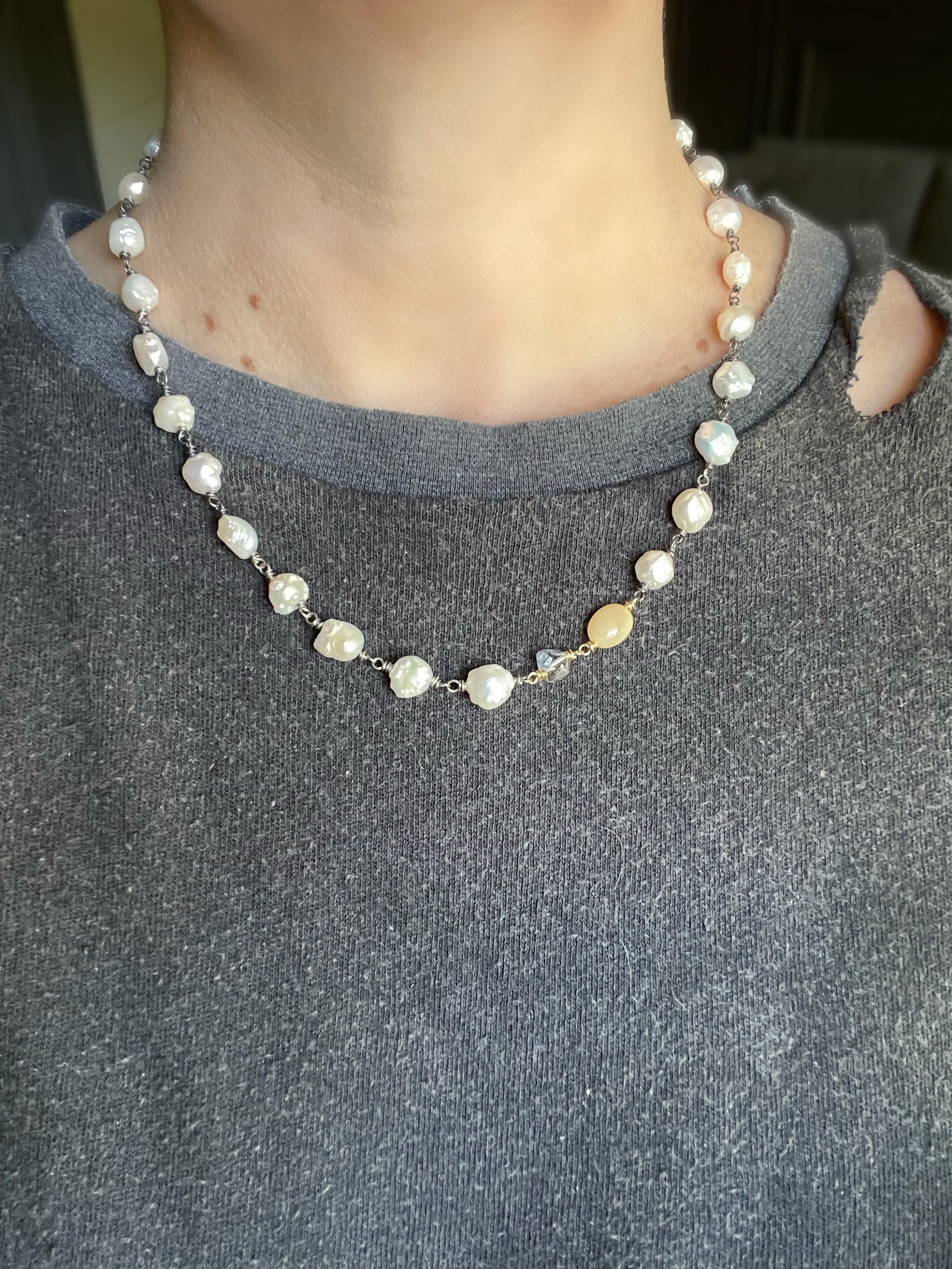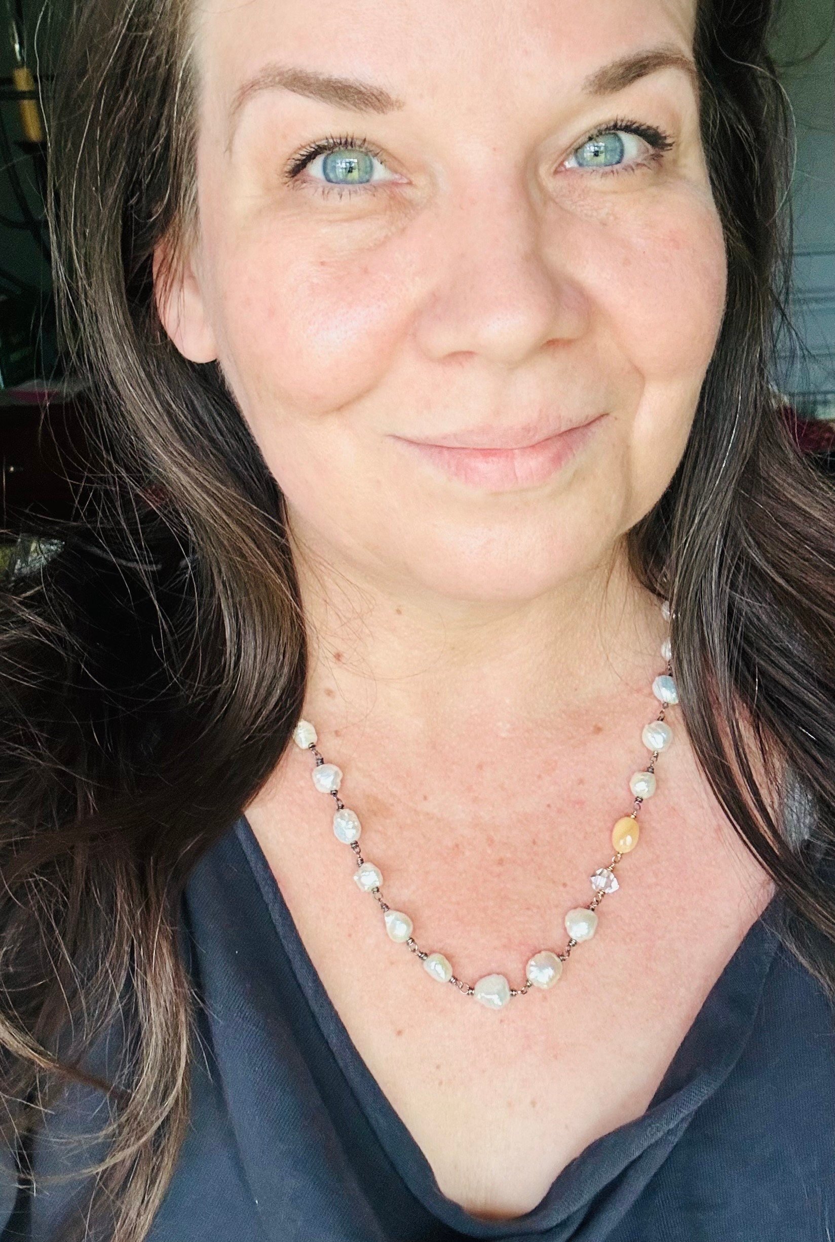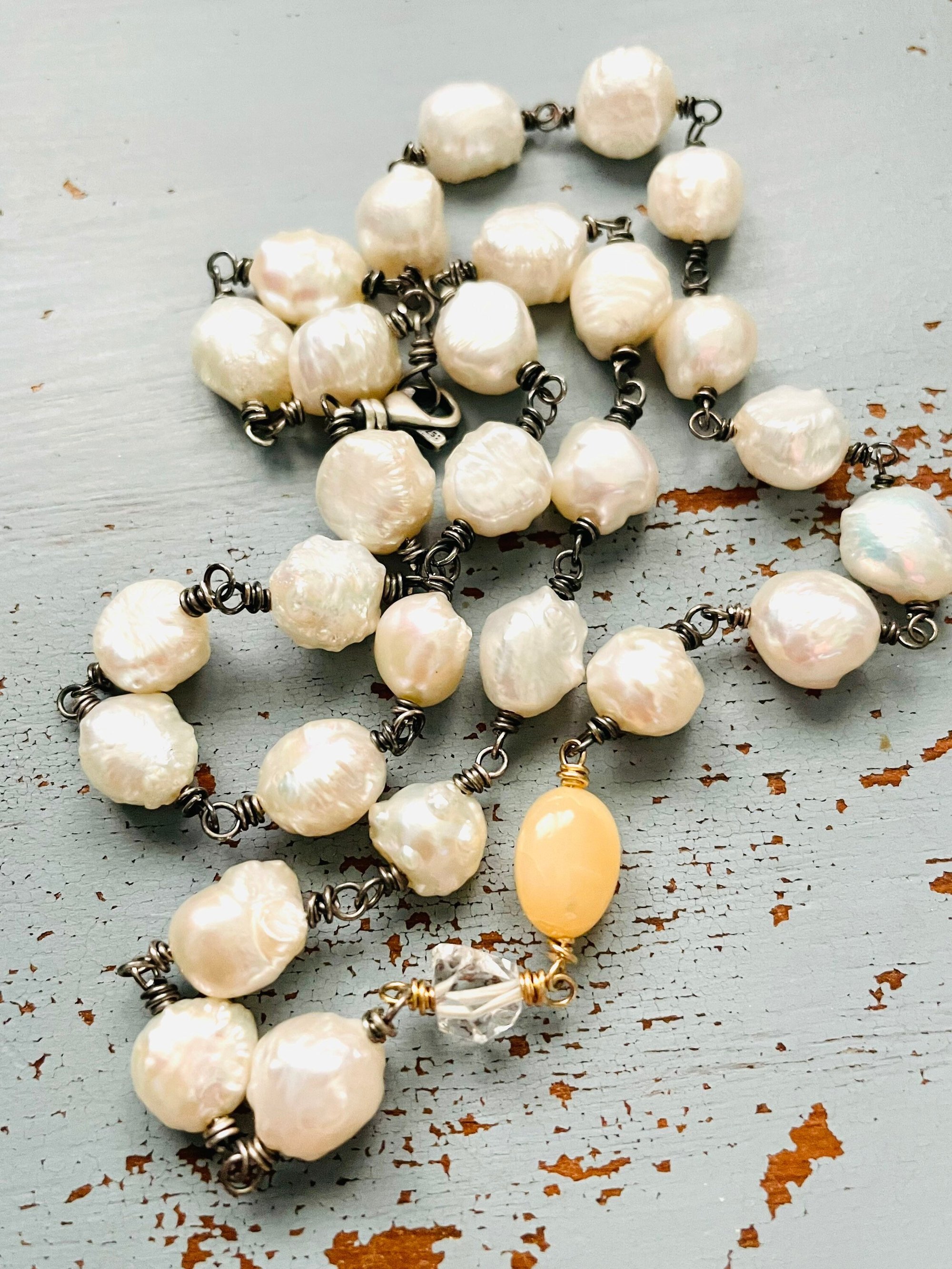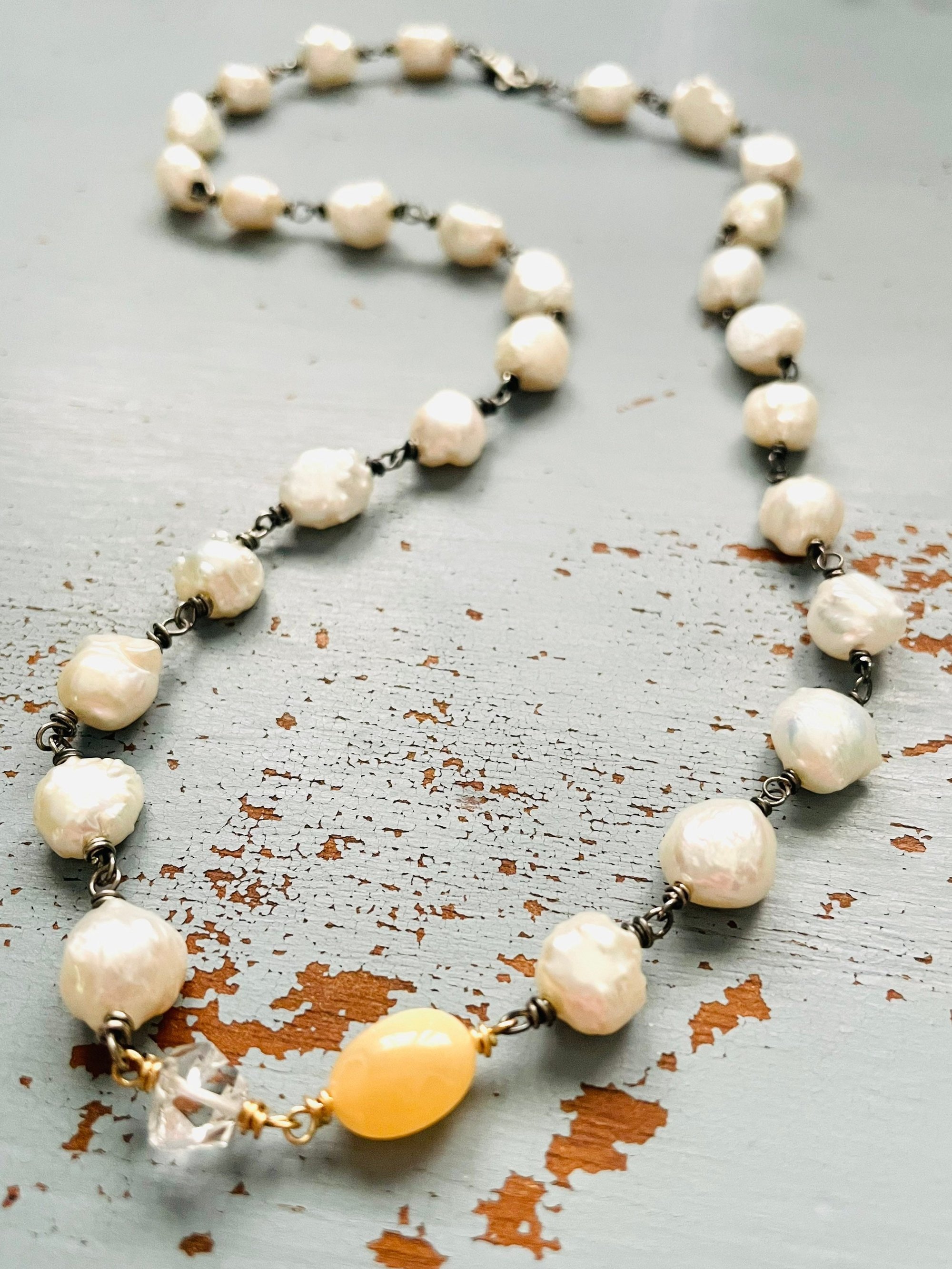 Handcrafted in my Nashville studio, a gorgeous wire wrapped pearl and high quality gemstone necklace.
