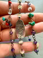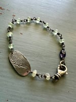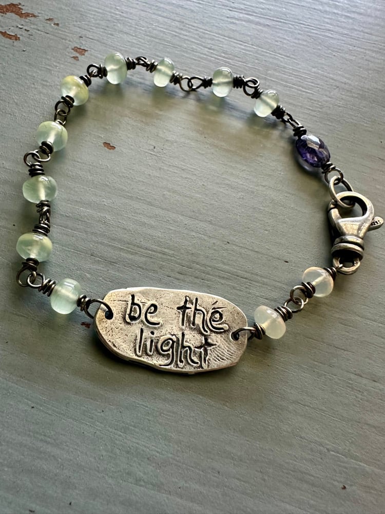 The gemstone chain is composed of polished rondelles of gorgeous prehnite and two Ethiopian opals, and one faceted oval of iolite, each wrapped in sterling silver wire.