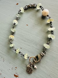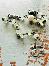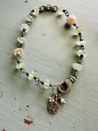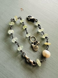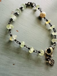 A one of a kind wire wrapped prehnite gemstone bracelet.