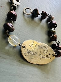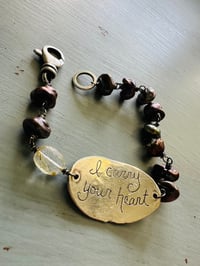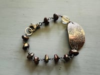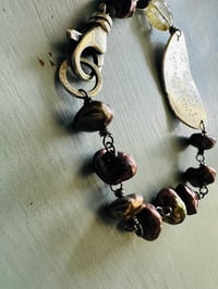 A chunky sterling silver medallion bracelet with wire wrapped pearls and gemstones.