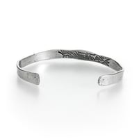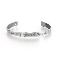 My signature feather engravings adorn the inside of this sterling silver cuff. On the outside, I wrote a quote by Saint Augustine,